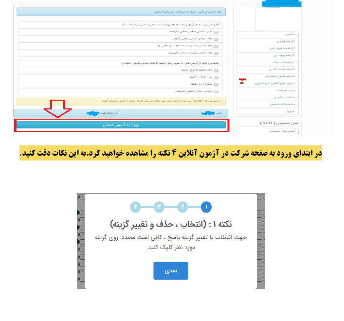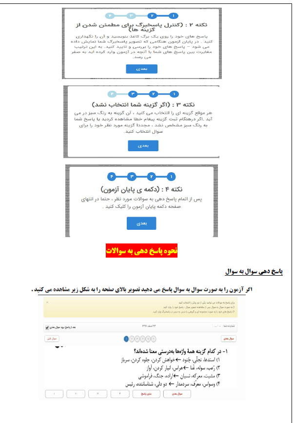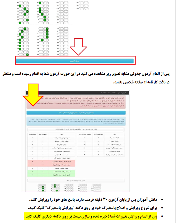 7 - پس از اتمام آزمون باید بر روی دکمه پایان آزمون کلیک کنید تا پاسخ های شما ثبت و فرایند صدور کارنامه آغاز شود .